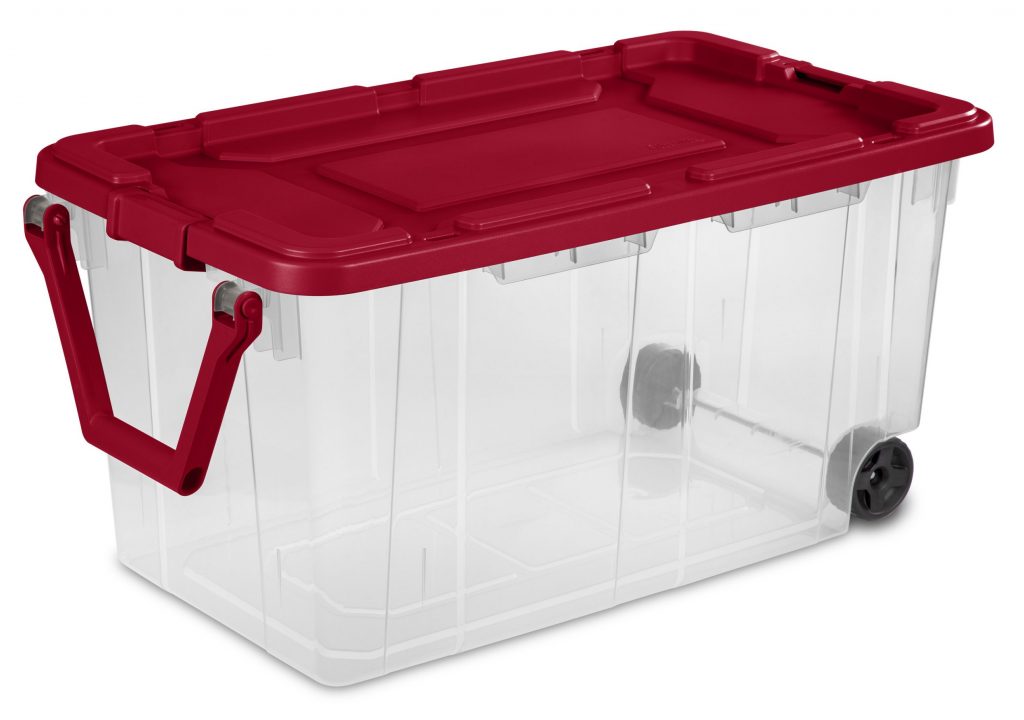 These Sterilite 160 Qt. Wheeled Storage Boxes in Infra Red were sitting there staring at us in the storage aisle. We almost walked by them, but I noticed Mr. Family Brick stopped and stared... I was already sold before he pointed them out. I like they have wheels on one end and a sturdy handle, making transport easier.