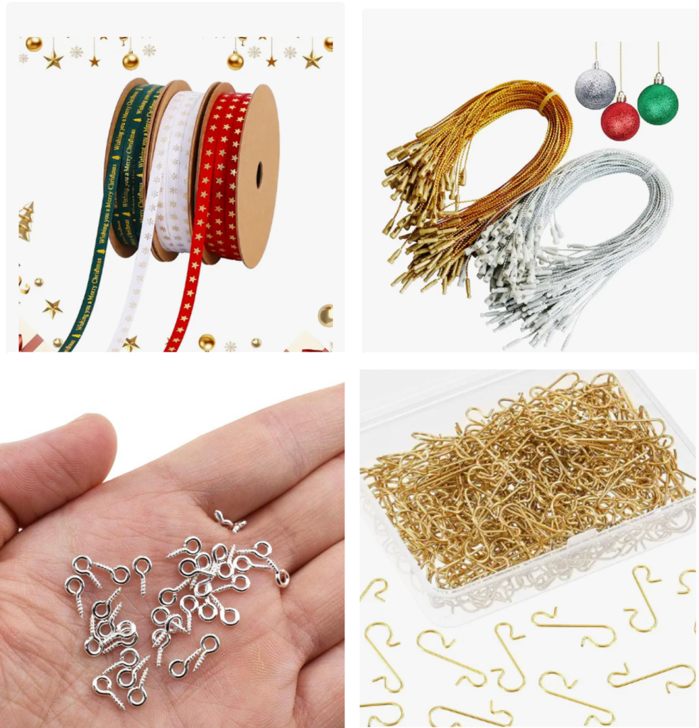 - Thin festive ribbon, ornament hanger string, or ornament hook