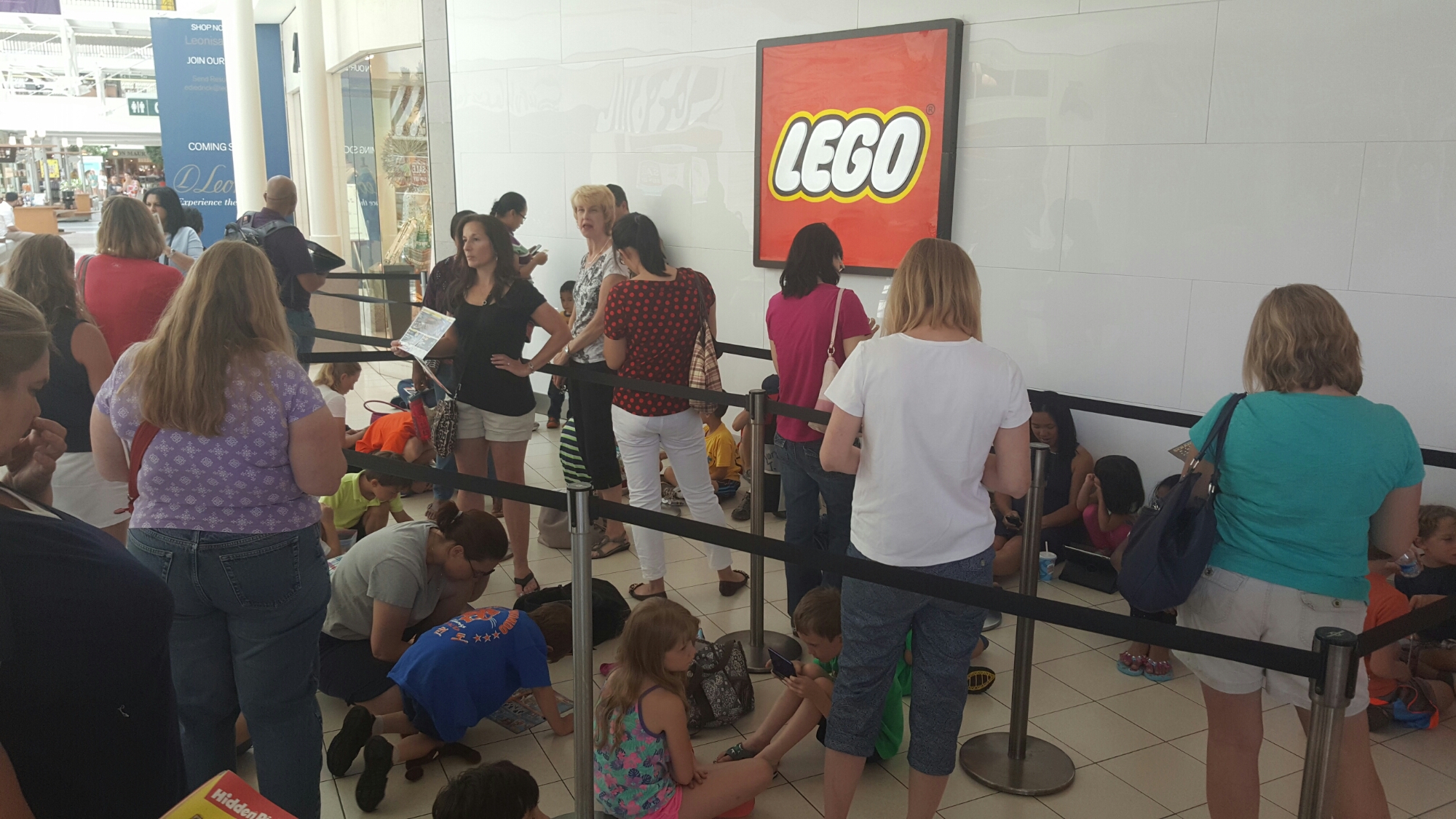 I came with two in tow: The Little Brick and her friend...so I was super glad to see my friend roll up with her little one and brick builder. Off I sent my friend and 3 girls to the playground so I could stand in line the next 30 minutes and wait for their tickets. By the time I got our tickets, the line behind me looked like this: