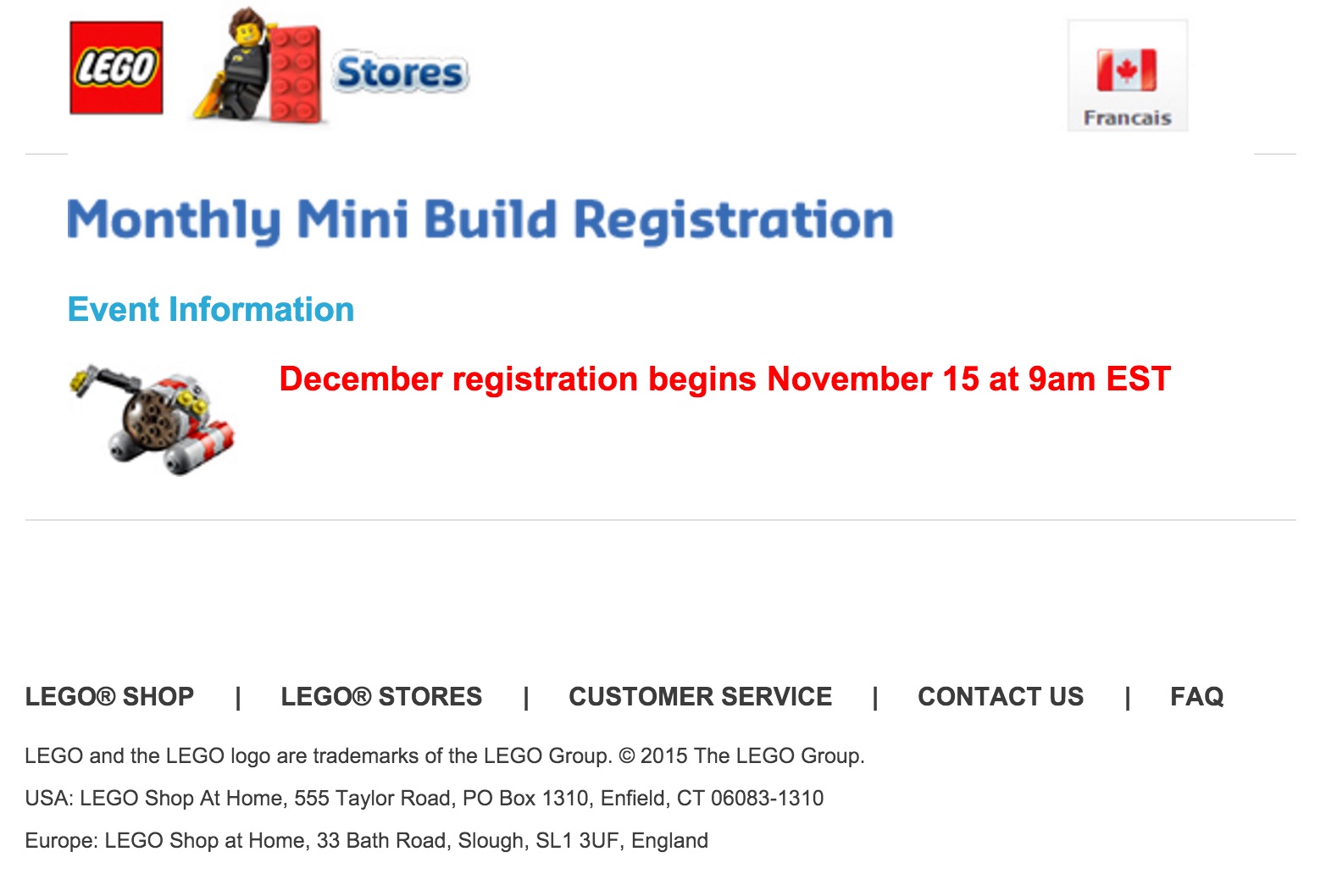 If you remember from my last monthly mini build registration post, our local stores will NOT be doing LEGO Club Meetings for the month of December. (Did anyone verify that in their area?) I got this information after speaking with a local Atlanta-area LEGO Store manager. (Please check with your local stores, as the milage may vary.) The reason behind the closing is that our malls will be opening up an hour early. This means the LEGO Club Meeting would need to happen at 8am in the morning, a time most parents don't want to be anywhere with kids on their weekends. So if you want to get your hands on next month’s mini build, make sure you register tomorrow.How To – December 2015 LEGO Monthly Mini Build Registration