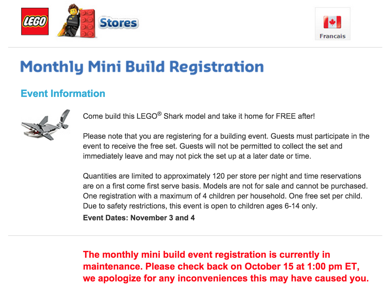 I never knew LEGO corporate had a waitlist for the mini build events. I wonder if this is a new addition to their online registration. Would explain the error with the confirmation/wait list confirmation emails…