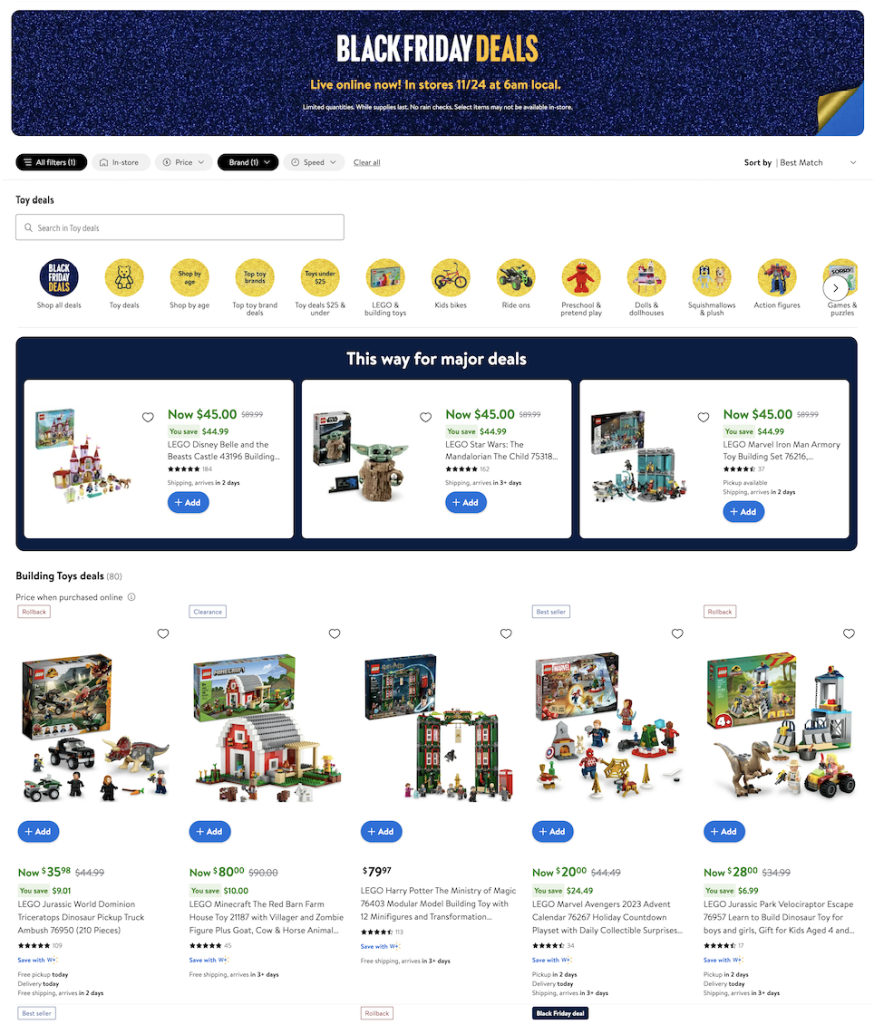This year, I noticed that Walmart has a full section dedicated to LEGO Black Friday specials. Instead of calling out one, I'm just gonna tell you to go check out the LEGO Black Friday Deals at Walmart to see which one calls your attention!