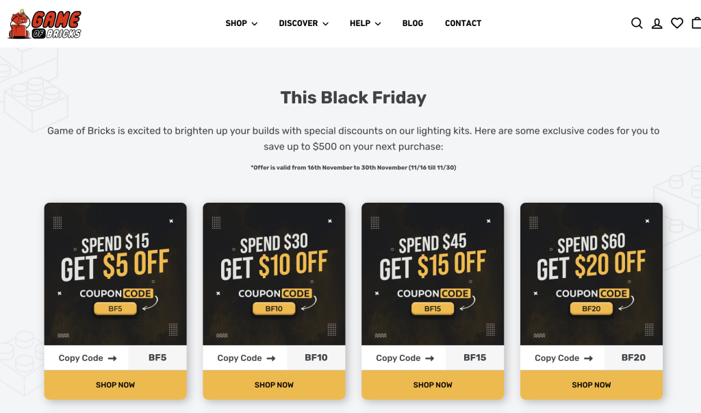 Game of Bricks is running a special from 11/16 - 11/30, where using the special codes below, you can get up to $500 off your purchases: